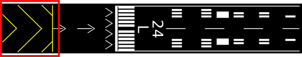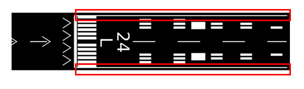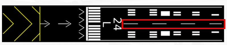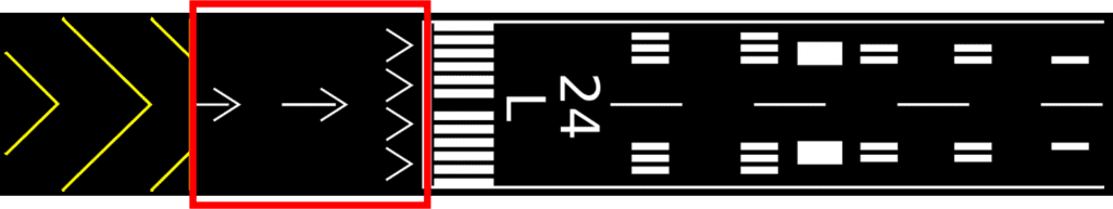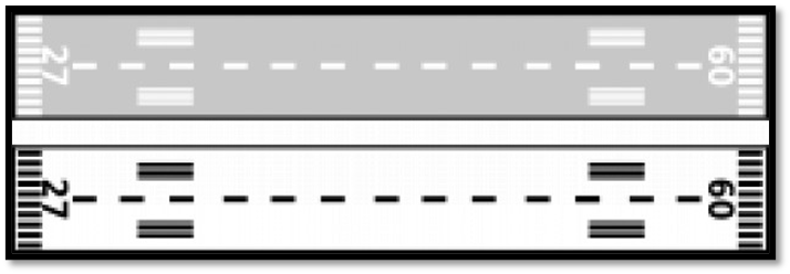 Na imagem acima pode-se ver uma pista com sua cabeceira deslocada e sua stopway. Lembramos que o pouso deve ser sempre efetuado após a faixa branca presente após a cabeceira deslocada, sendo proibido o pouso na mesma e também na stopway.