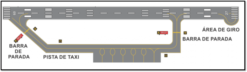 Linha central – É uma linha amarela contínua que indica a faixa central da pista de táxi.