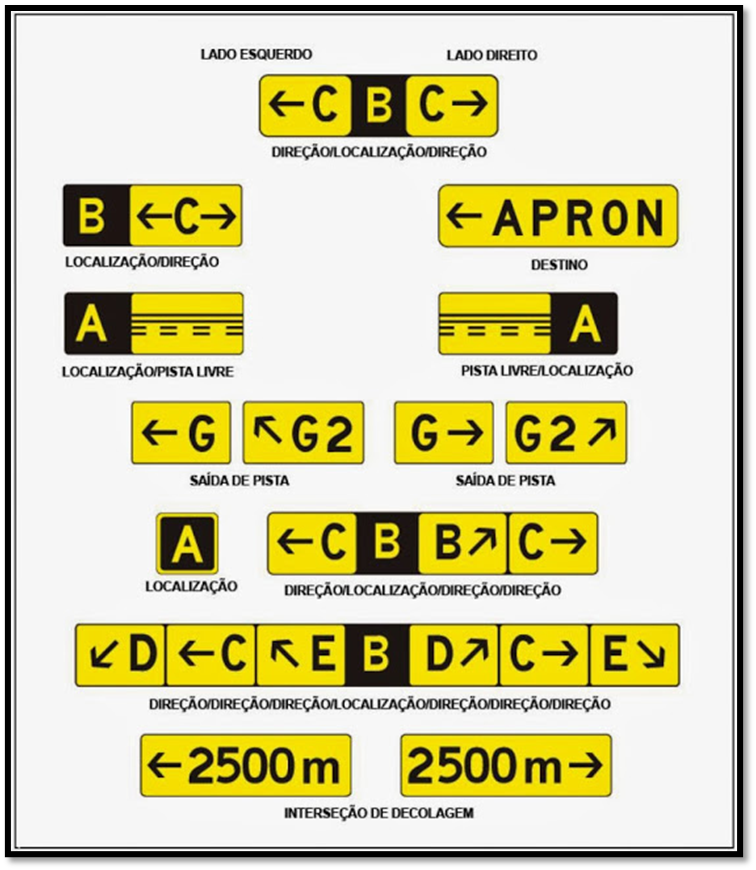 Sinais de direção – Possuem o fundo amarelo com a descrição na cor preta. Esses sinais são utilizados para sinalizar a direção de uma determinada taxiway.