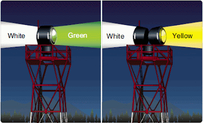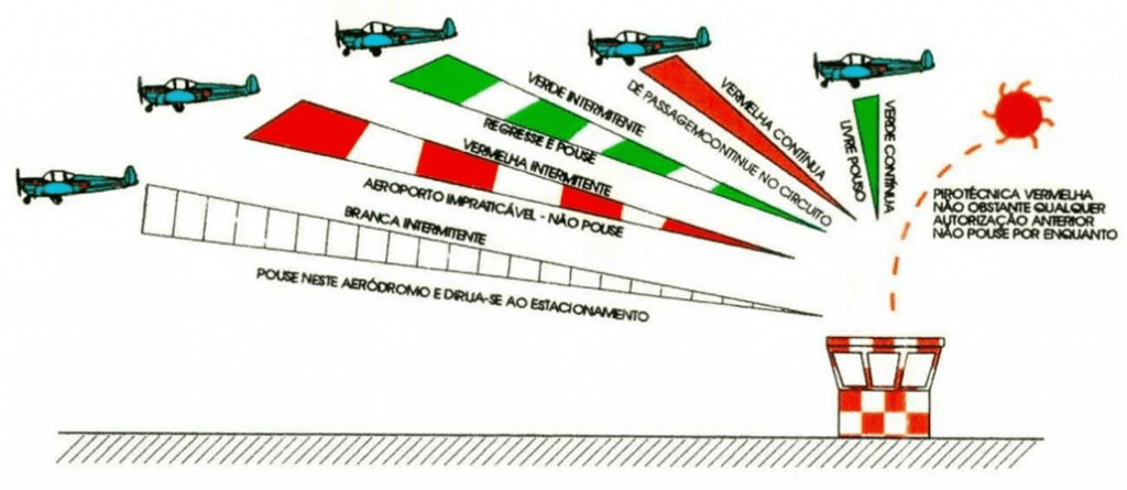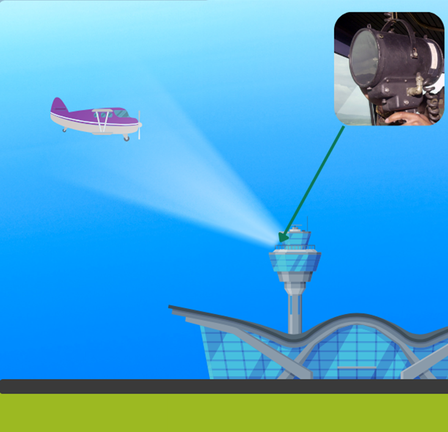 A torre de controle usa pistolas de sinais luminosos que emitem feixes de luz na cor selecionada pelo controlador (Verde, vermelha e branca).