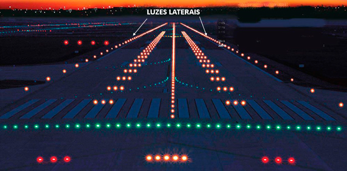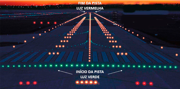 Pode-se ver claramente na imagem as luzes verdes que indicam o início da pista e as luzes vermelhas que indicam o final da pista.