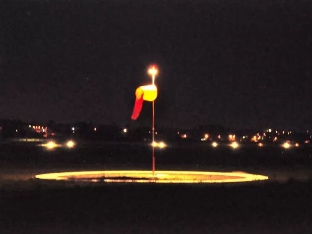 A biruta dos aerodromos também possuem iluminação para facilitar que os pilotos à vizualizem bem durante o periodo noturno.