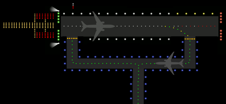 Luzes centrais – São luzes na cor verde utilizadas no período noturno e em condições de baixa visibilidade, que indicam o eixo central das pistas de táxi.