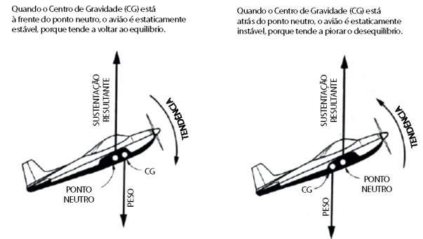 - A aeronave se torna menos estável quando o CG é movido para trás, haja vista a redução do ângulo de ataque, mas tem a sua controlabilidade aumentada. Portanto, a contribuição da asa para a estabilidade da aeronave é agora diminuída, enquanto a contribuição da cauda ainda está se estabilizando. Quando o deslocamento do CG alcança um ponto em que as contribuições das forças da asa e da cauda se equilibram, então existe estabilidade neutra. Qualquer movimento do CG mais para trás desse ponto resulta em uma condição de instabilidade da aeronave;