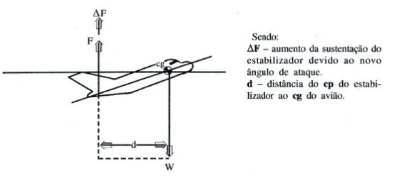 Fruto do aumento do ângulo de ataque do estabilizador, esse irá gerar uma força extra ΔF para cima, tendendo a baixar o nariz do avião por meio do Momento ΔF x d. Devido aos pequenos braços da asa e da fuselagem em relação ao CG, seus Momentos tornam-se desprezíveis e a estabilidade da aeronave torna-se dependente da ação do estabilizador horizontal.