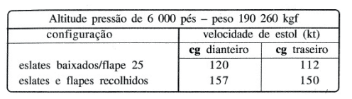 Considerando as mesmas duas aeronaves uma com CG próximo do limite dianteiro e outra com o CG próximo do limite traseiro, imaginemos que ambas iniciam uma redução de velocidade, até atingirem a situação de Estol. A aeronave com CG dianteiro atingirá a velocidade de Estol primeiramente, pois ela já se encontrava com maior ângulo de ataque, em relação à outra aeronave com CG traseiro. Na figura a seguir, é apresentado um extrato da tabela de velocidades de Estol da aeronave McDonnell Douglas MD-11. Repare que na situação de CG dianteiro, a aeronave apresenta velocidades de Estol maiores do que na situação de CG traseiro.
