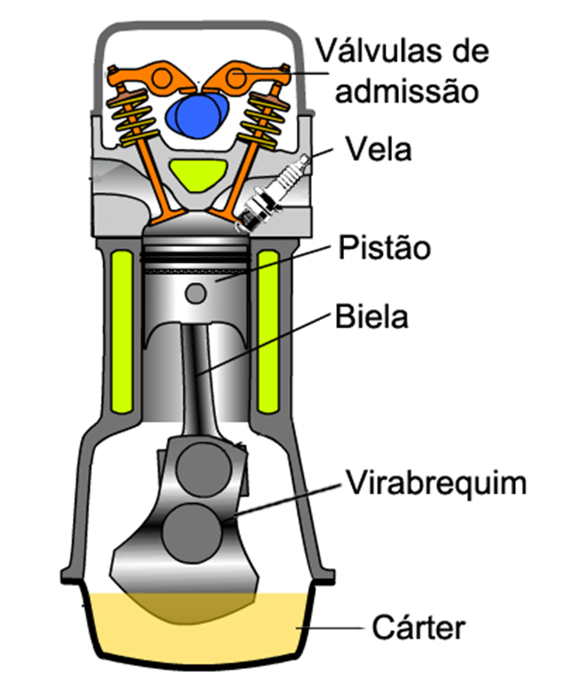 É a parte do motor onde a carga combustível é admitida, comprimida e queimada. Ele é feito de material resistente, leve e bom condutor de calor. O cilindro é constituído de duas partes: o corpo e a cabeça.