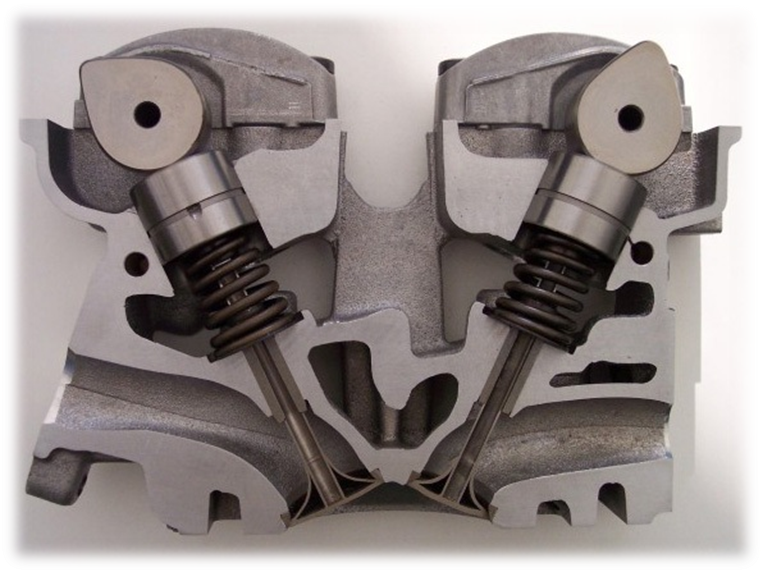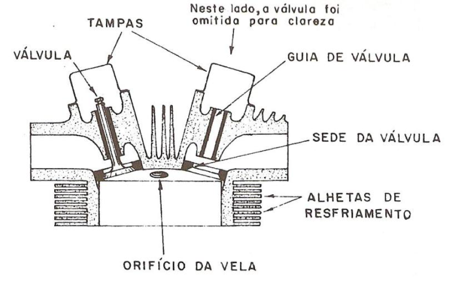 Cabeça – Geralmente é feita de liga de alumínio, e nela são instaladas as valvulas e as velas de ignição. As válvulas são instaladas dentro do guia de válvulas, e suas cabeças se assentam sobre anéis de metal resistentes denominados sedes de válvula.