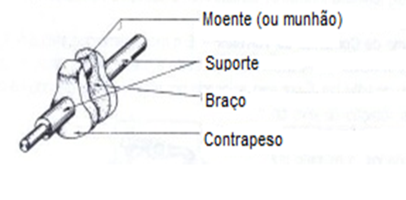 O eixo de manivelas, também chamado de virabrequim, é uma peça giratória que recebe a força do pistão, através da biela. Possui as seguintes partes:
