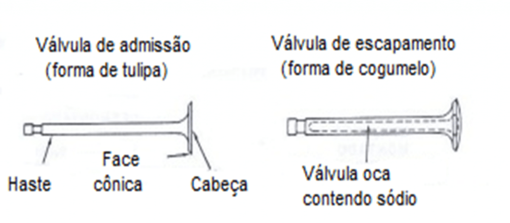A válvula de admissão geralmente tem a cabeça em forma de tulipa, e a de escapamento a forma de cogumelo, por razões aerodinâmicas, pois facilita o fluxo dos gases. As faces das válvulas que se assentem nas sedes são cônicas para se ajustarem melhor, e são endurecidas para reduzir o desgaste. A válvula de admissão é resfriada pela própria carga combustível, mas a de escapamento está sujeita a forte aquecimento. Por isso ela é feita de material especial, ou então possui o interior oco, contendo certa quantidade de sódio. Está funde-se a pouco mais de 90°C e movimenta-se dentro da válvula, transferindo o calor da cabeça para a haste que é resfriada através do contato com a cabeça do cilindro.
