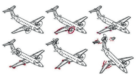 A figura a seguir apresenta o esquema de um acidente envolvendo um avião Beech 1900C em 28 de dezembro de 1991. A Agência Nacional de Segurança nos Transportes dos Estados Unidos (NTSB) investigou o acidente e determinou como sua possível causa a perda de consciência da altitude e desorientação espacial