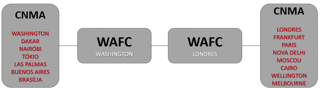 Para isso foi criado dois grandes centros de meterologia mundiais, WAFC, um em Washington e outro em Londres. E ligados a eles centros nacionais de meteorologia aeronáutica CNMA.