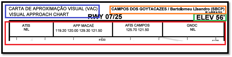Na área em vermelho encontram-se as frequências utilizadas nesta localidade. Toda vez que a terminologia “NIL” aparecer significa que este aeródromo não possui frequência disponível para utilização nessa categoria como é o caso do ATIS e do GNDC do aeródromo de Campos.