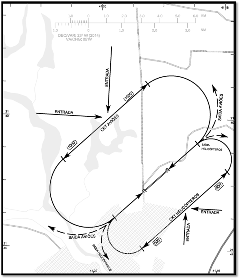A primeira informação que temos é que as aeronaves devem ingressar no circuito sempre a 45° e quando for avião efetuar circuito sempre pelo setor NW do aeródromo e quando helicóptero efetuar o circuito pelo setor SE do aeródromo. Sendo que os aviões devem manter circuito a uma altura de no mínimo 1000 pés enquanto os helicópteros mantem circuito a uma altura de 500 pés. As cartas de aproximação também mostram o perfil de saída que as aeronaves em voo visual devem cumprir quando estiverem partindo do aeródromo que utiliza a carta. O perfil é mostrado pelas linhas tracejadas conforme vemos na imagem, e nesta carta, a informação que ela nos traz é: