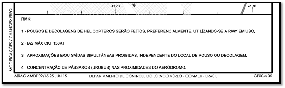 Podemos ver que a VAC de SBCP traz 4 informações. Dentre elas limitações de velocidade, restrições de pousos e decolagens simultâneas. Em alguns casos neste campo também pode vir mencionado as condições do espaço aéreo nos arredores do aeródromo como a concentração de aves nas proximidades do aeródromo mencionado na VAC de Campos.