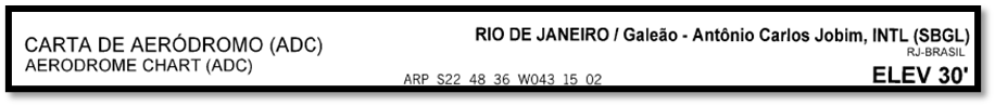 Primeiramente, vem apresentado na carta um cabeçalho com algumas informações como: tipo de carta, nome e ICAO do aeródromo, localidade do aeródromo, elevação etc como podemos ver abaixo: