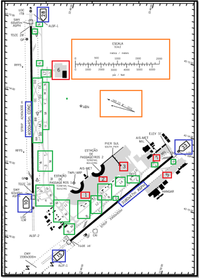 Nesta mesma área, aparecem também as sinalizações horizontais e auxílios luminosos instalados nas pistas e pôr fim a carta traz algumas observações no campo RMK que são úteis ao voo.