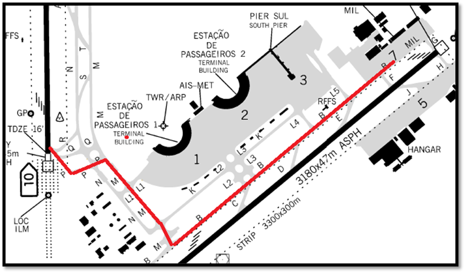 Uma das informações que essa carta traz são as informações de pátio marcadas de vermelho na imagem acima. Vemos que o aeroporto do Galeão possui sete pátios de estacionamento, sendo os pátios 1, 2, 3, 4, 5 e 6 pátios destinados a aviação civil e o pátio 7 reservado a aviação militar. Ligando os pátios as pistas podemos ver as taxiways, cada taxiway recebe uma letra como designativo (marcadas em verde na imagem acima), e a função delas é orientar as aeronaves do pátio até as pistas. Por exemplo, uma aeronave encontra-se no pátio 7 e deve decolar da cabeceira 10. Está é orientada pelo solo a seguir pela taxiway B, M, P. O piloto então deve seguir conforme mostrado abaixo.