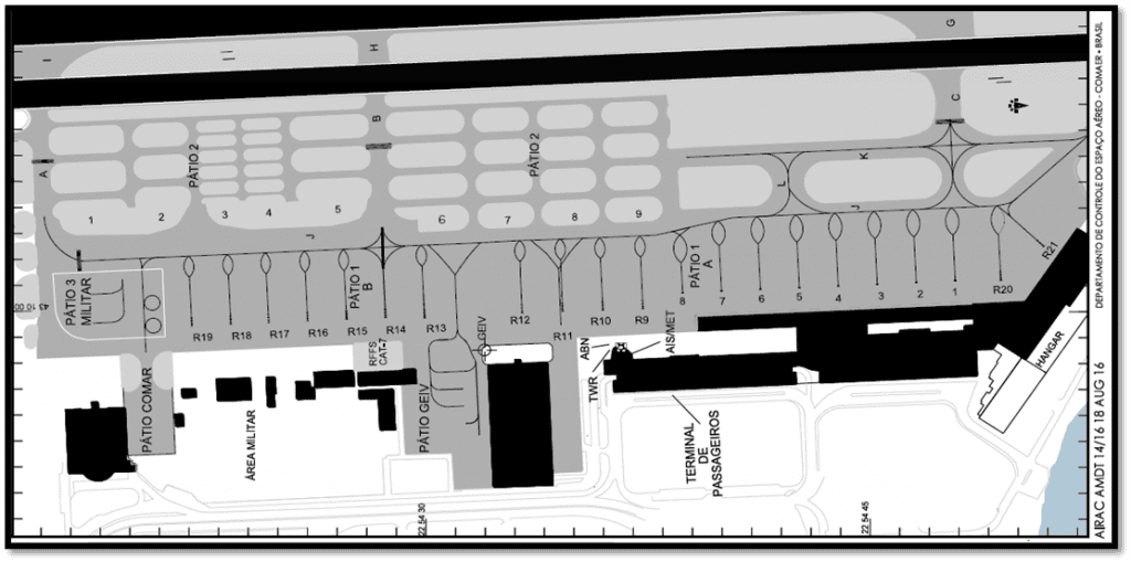 Podemos ver na carta que o aeródromo de Santos Dummont possui três pátios. Sendo o pátio 1 dividido em parte A e parte B destinado a operação de aeronaves de linha aérea. Pátio 3 destinado ao uso militar e pátio 2 destinado ao uso da aviação geral. Outros dois pátios também aparecem na carta, o pátio do GEIV e o pátio do COMAR destinados também ao uso militar. Podemos ver que no pátio 1 temos as posições de 1 a 8 com designação numérica e as posições de R9 a R21 com designação alfanumérica. Isso significa que as posições de 1 a 8 possuem portão de embarque e desembarque, os famosos gates. Já as posições de R9 a R21 são posições de parking onde o estacionamento bem como embarque e desembarque é remoto.