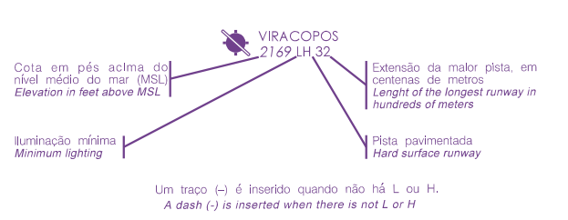 Como pode-se ver na imagem abaixo o primeiro grupo de números indica a altitude do aeródromo seguido da letra L que indica que o aeródromo possui iluminação mínima para operação noturna e da letra H indicando que o aeródromo possui pista pavimentada. O último grupo de números corresponde ao comprimento a pista em centenas de metros. Como mostrado na legenda, o traço (-) será colocado quando não há iluminação (L) ou caso a pista não seja pavimentada (H).
