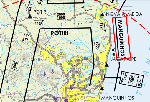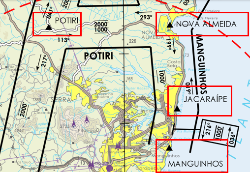 Vemos que o rumo usado na ida (posição jacaraípe – Posição Nova Almeida) é o 019° e na volta (Posição Nova Almeida – posição Jacaraípe) é o 199° e a altitude máximae mínima para esse trecho é de 1000 pés.