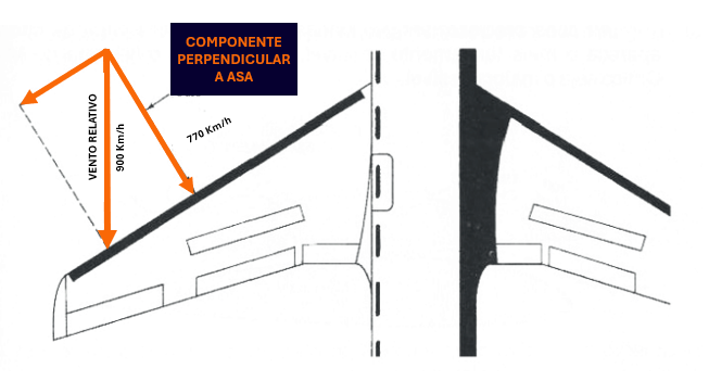 Para a asa enflechada, no entanto, o fluxo que é levado em consideração para a ocorrência dos efeitos de compressibilidade é apenas aquele da porção perpendicular à asa (ou seja, paralelo à Corda Média Aerodinâmica), cuja velocidade (770 Km/h) é inferior à de deslocamento real do aerofólio.