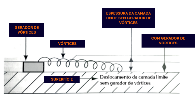 • Os vórtices captam o ar fora da Camada Limite, “injetando-o” em forma espiral ao ar da Camada Limite, que está “cansado”. Assim a camada é energizada (e por vezes tornada mais fina) e o gerador de vórtice pode adiar, controlar ou prevenir a estagnação ou o seu descolamento (lembre-se, o descolamento pode ser causado por Ondas de Choque ou por meio da elevação do ângulo de ataque). Os Geradores de Vórtices podem causar turbulência na Camada Limite, mas reduzem as suas chances de se estagnar ou descolar;