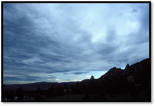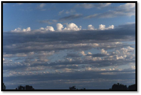 b) Stratocumulus (Sc) – banco, lençol ou camada de nuvem cinzentada ou esbranquiçada que têm partes escuras compostas de massa ou rolos arredondados, os quais podem estar soldados entre si ou apresentar aberturas nas áreas mais finas. É a nuvem que caracteriza o equilíbrio condicional (turbulência apenas dentro da nuvem).