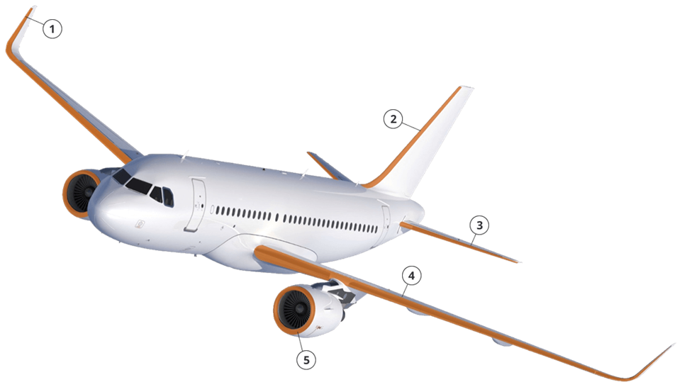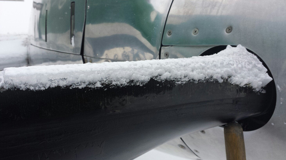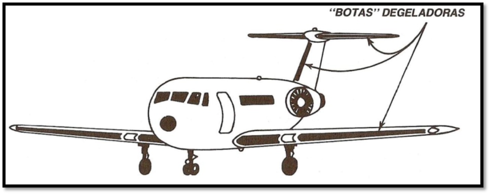 - Bordos de ataque das asas e empenagem – Nestas áreas, o gelo altera o perfil aerodinâmico, afetando o vôo. Pode ser combatido pelo degelo térmico (circulando ar quente dentro dos bordos de ataque), ou por degelo pneumático (“botas” infláveis de borracha, que literalmente quebram a camada de gelo