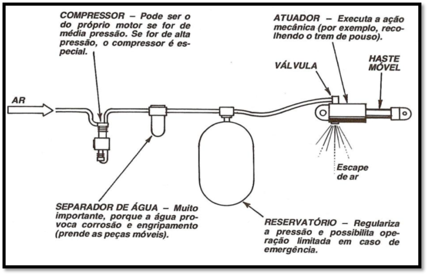 Sistema pneumático de emergência – Serve para suprir a falha de um sistema pneumático principal ou de um sistema hidráulico. Nesse último caso, o cilindro pneumático é abastecido no solo com nitrogênio ou gás carbônico sob pressão elevada.