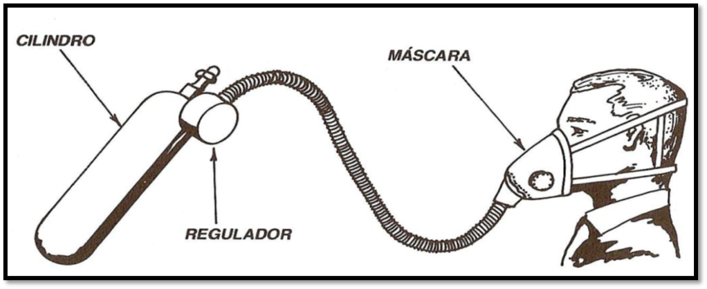Máscara – É usada para a respiração individual. Se o regulador fornece oxigênio puro, a máscara deixa espaços abertos para permitir a diluição com o ar. Se o regulador fornece oxigênio diluído, a máscara adapta-se perfeitamente à face. Abaixo de 34.000 pés de altitude, não se deve respirar oxigênio puro