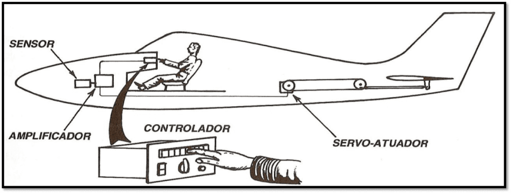 - Amplificador – É um dispositivo que verifica se a condição de voo corresponde à condição desejada. Se houver desvio, envia uma ordem de correção ao servo- atuador (por exemplo, mover o profundor para cima).