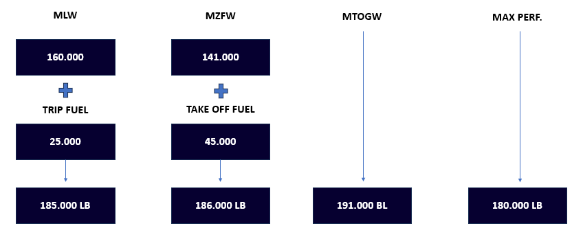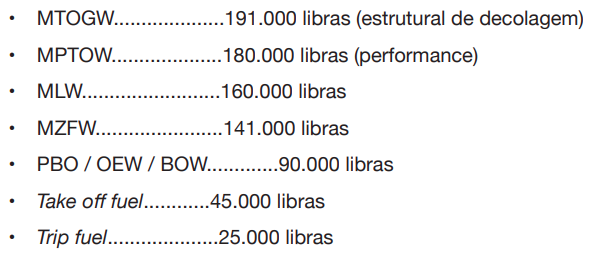 Consideramos aqui o Peso Máximo de Decolagem, que será o menor entre os seguintes limites: Peso Máximo Estrutural de Decolagem, Peso Máximo de Performance de Decolagem, Peso Máximo de Decolagem em função do Peso Máximo Zero Combustível e Peso Máximo de Decolagem em função do Peso Máximo de Pouso.