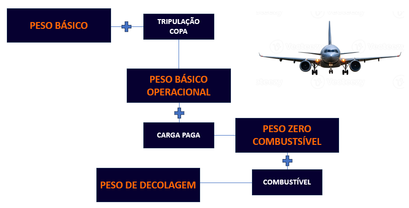 O peso total da aeronave é composto pela sua estrutura, combustível, tripulação, passageiros, bagagens e carga. Qualquer variação nesses elementos altera o comportamento da aeronave, afetando parâmetros essenciais como distância de decolagem, razão de subida, consumo de combustível, alcance, teto de serviço e desempenho em pouso.