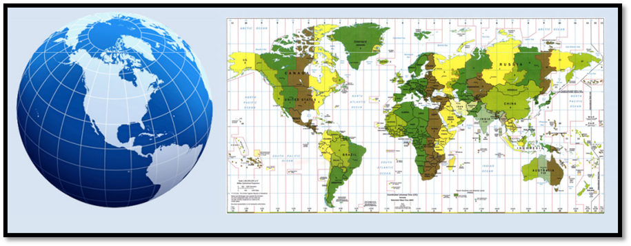 Antes de iniciarmos a tratar sobre as características das projeções nada mais justo do que trazer o conceito de projeção. Projeção nada mais é do que a representação gráfica da Terra ou parte dela, desenvolvida numa superfície plana, na qual aparece, com destaque, o gradeado formado por paralelos e meridianos. Conforme mostrado na figura abaixo.