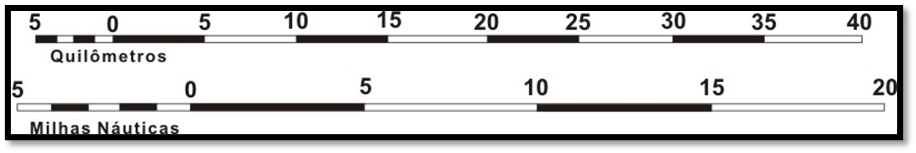 Essa representação de escalas aparece constantemente nas cartas e a sua utilização consiste em comparar a distância medida numa carta, utilizando qualquer instrumento para efetuar a medida, com a escala para assim determinar a distância real. Observar que, a escala mostrada acima está graduada em quilômetros e em milhas náuticas, então é importante sempre estar atento a unidade de graduação da escala para não cometer erros.