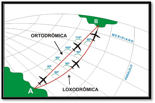 Igualmente, na superfície esférica, uma direção que mantem o mesmo ângulo com a convergência dos meridianos é representada por uma curva ou segmentos de retas que formam uma única direção. Desta forma, temos dois tipos de rotas, a rota ortodrômmica e a rota loxodrômica.