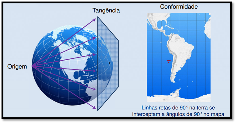 Para se projetar uma superfície esférica em uma superfície plana, e para que isso seja representado em máximos de detalhes, há a necessidade de se considerar três fatores: Conformidade, tangencia e origem.