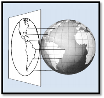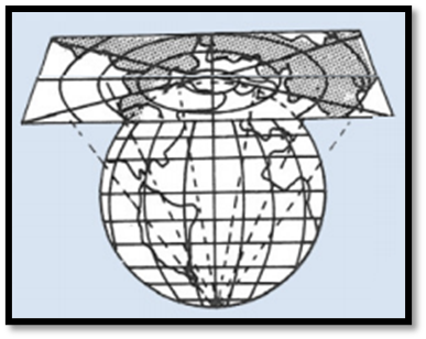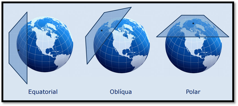 Tangência de Projeção: A parte onde o plano é desenvolvido ao tocar na superfície da Terra. Podem ser classificados de três maneiras: polar, oblíqua e equatorial.