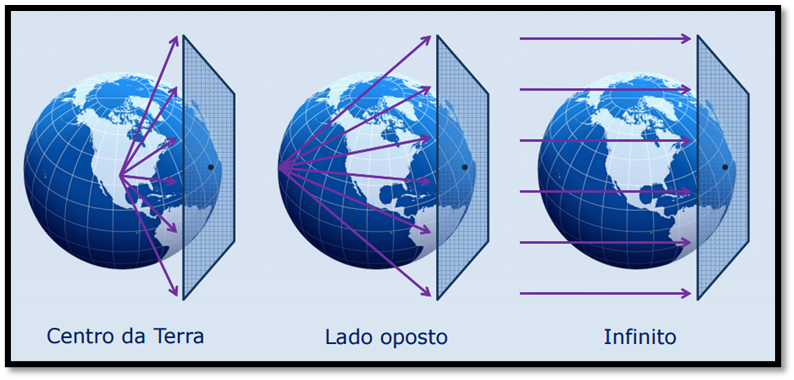 Origem das Projeções: O ponto inicial imaginado para o desenvolvimento de uma projeção, são três os pontos de origem: centro da Terra, lado oposto e infinito.