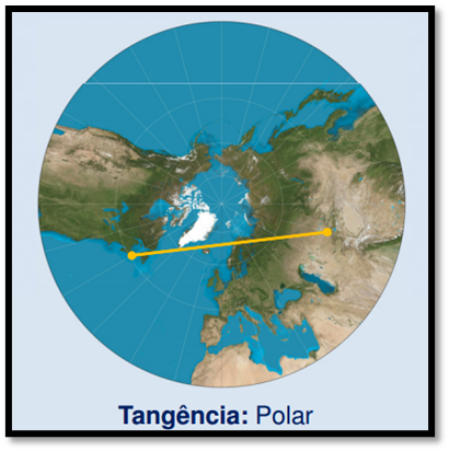 Quando uma linha reta for traçada representará uma rota ortodrômica E o seu limite prático aceitável é a partir de 50° para o respectivo polo. Não é uma projeção conformal. É exata só nos pontos de tangencia.