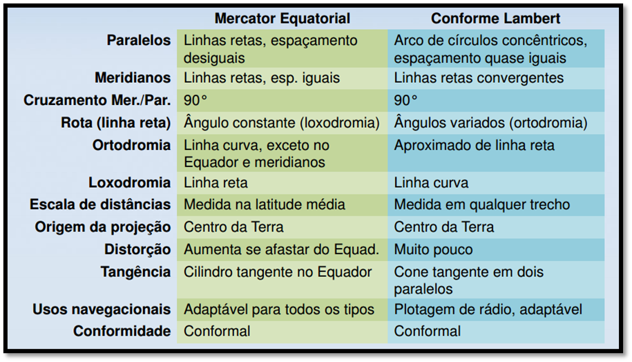 As projeções mais utilizadas nas cartas aeronáuticas são as projeções Lambert e Mercator.