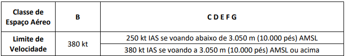 Os limites de velocidade para o voo sob as VFR estão contidos na tabela abaixo