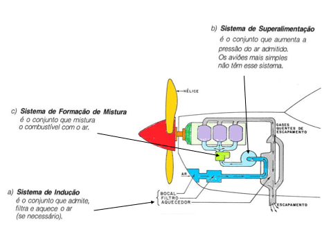 Sistema de superalimentação – É o conjunto que aumenta a pressão do ar admitido. Os aviões mais simples não têm esse sistema.