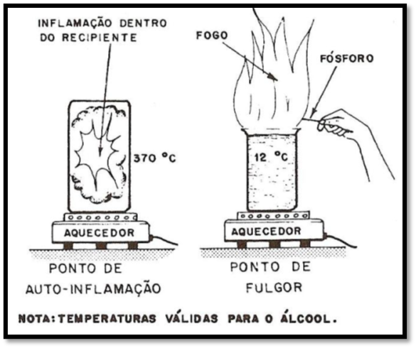 Ponto de fulgor e ponto de auto- inflamação – São duas temperaturas importantes a serem consideradas na combustão dos líquidos. No ponto de fulgor, o liquido produz vapores inflamáveis em condições de se inflamar, mas o fogo só ocorre se for provocado por uma chama, faísca ou outra fonte de calor. No ponto de auto-inflamação, o líquido está totalmente vaporizado e se inflama espontaneamente devido à própria temperatura.