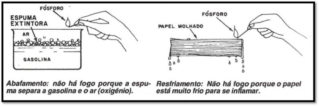 Princípio de combate ao fogo – Para que um material possa entrar em combustão, é preciso que existam três fatores: o combustível, o oxigênio e o calor. Para extinguir o fogo, basta eliminar ou isolar um desses fatores. Os dois principais métodos de extinção de fogo são o abafamento e o resfriamento, que estão ilustrados abaixo:
