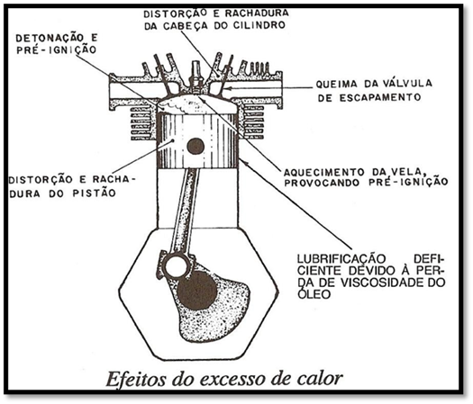 Conforme mostra a figura ao lado, o excesso de temperatura causa efeitos nocivos em diversas partes do motor.