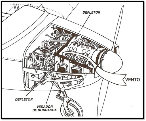 Nos motores com cilindros horizontais opostos, os defletores formam uma caixa de ar acima dos cilindros, onde a pressão foi aumentada devido ao impacto do ar que entra em na carenagem. Essa pressão faz com que o ar desça verticalmente, atravessando as alhetas dos cilindros:
